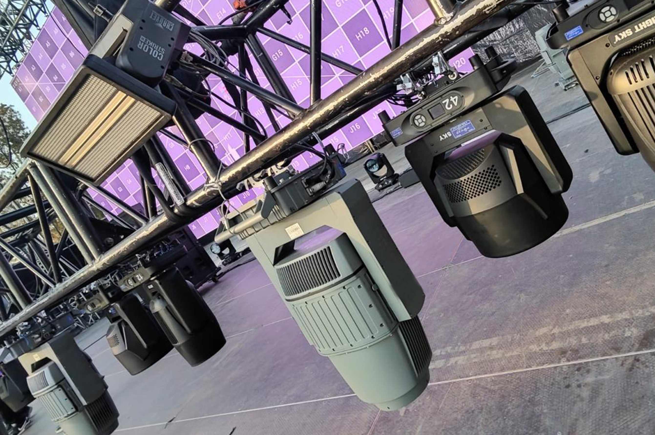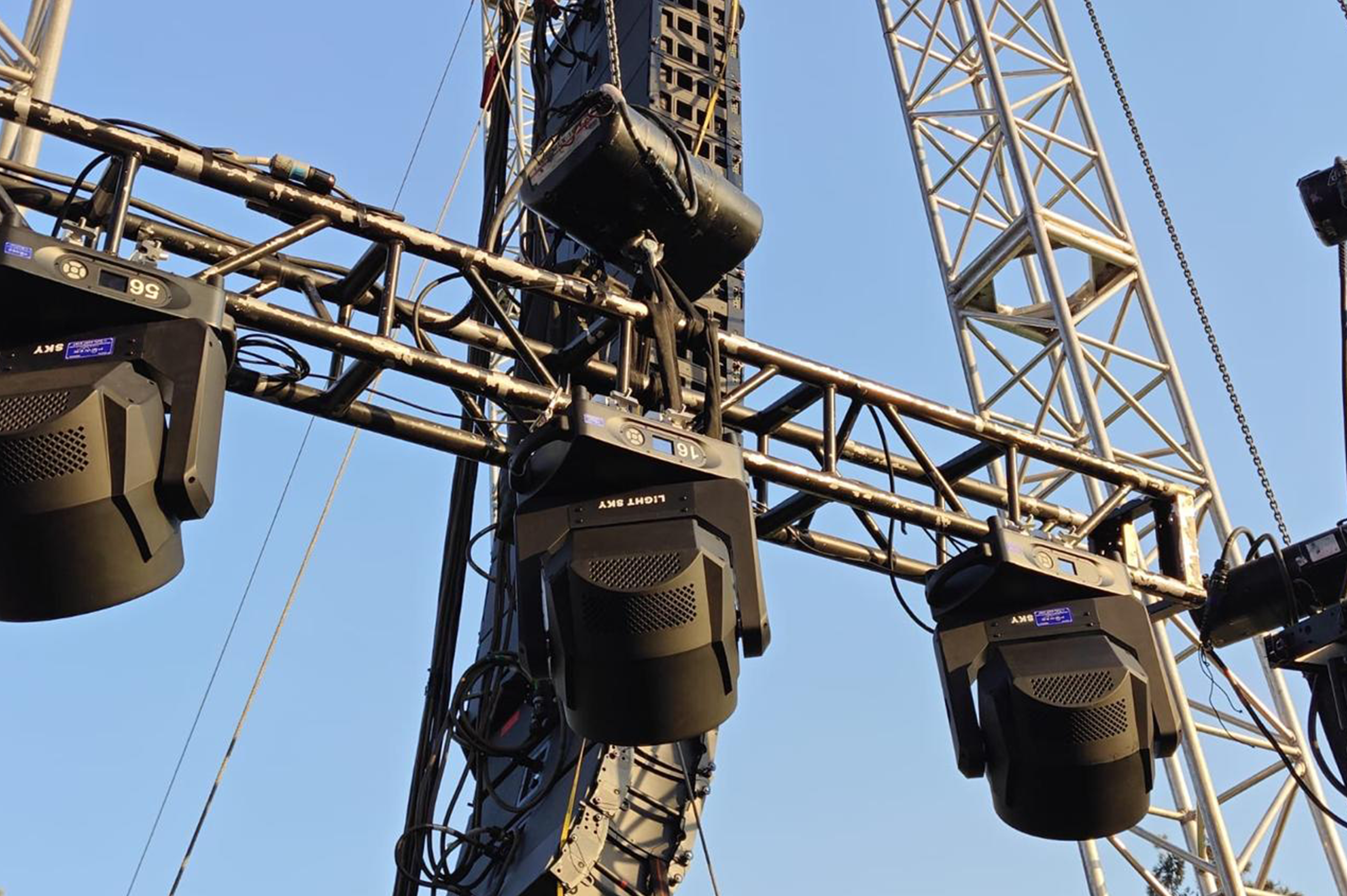In an outdoor environment of this scale, each fixture plays a distinct role within a cohesive visual architecture: beams pierce the open air with focused intensity, washes envelop the venue in evolving color that shapes the collective mood, and profiles add definition through precise textures and accents that sculpt every moment on stage.