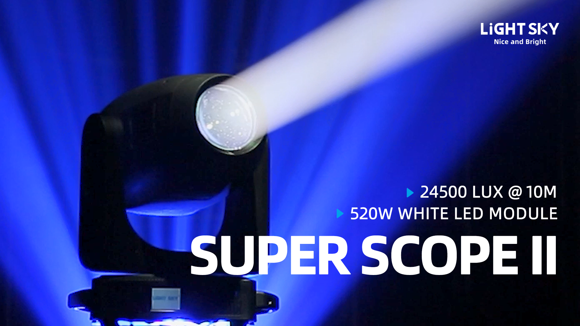 Powered by a 520W white LED module, the SUPER SCOPE II delivers 24,500 lux at 10 meters. With a flexible zoom range, advanced color control, and adjustable soft light effects, it achieves outstanding visual clarity and creative flexibility for any stage design. Together with the 600W RGBAL SUPER SCOPE COLOR and waterproof SUPER SCOPE AQUA, the series defines a new standard of hybrid BSWP performance—bringing power, precision, and artistry into one.